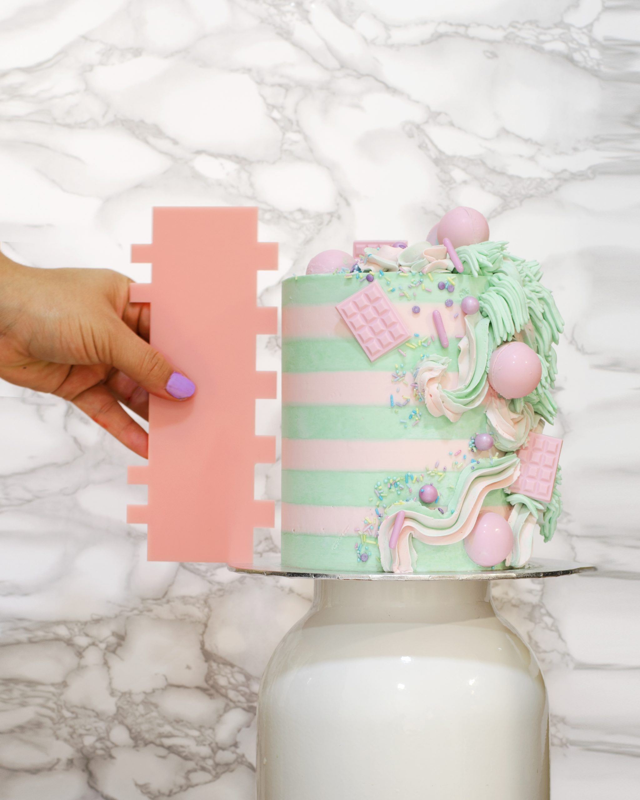 This acrylic scraper or comb stands at 20 cm tall (7.87 inches tall). It has different designs on both sides so you can have two options to choose from per scraper when decorating your cake.