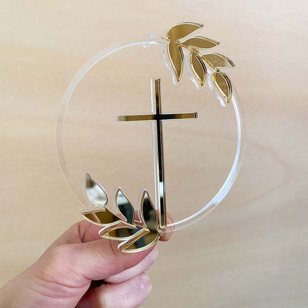 It has double layered acrylic, the back part is clear acrylic and the front is made with mirror acrylic. It has two small stakes in the back perfect to hold the plaque onto the front of the cake.